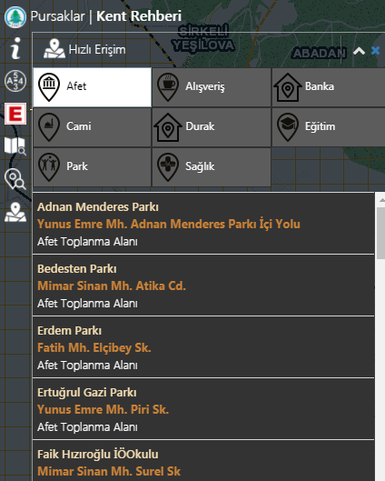 Kentteki önemli noktalara hızlıca erişim sağlayabilirsiniz. Harita üzerinde tematik gösterim yapılır.