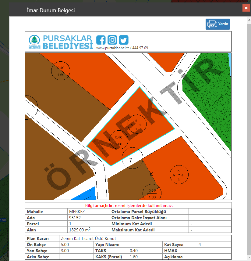 imar durum belgesi alınabilir, plana ilişkin notlar görüntülenebilir, kente dair tüm bilgilere